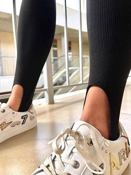 Легінси в рубчик мають досить лаконічний дизайн. Родзинки моделі – висока посадка, широкий пояс та акуратні штрипки з тієї ж тканини, що й штанини. Смужка тканини, що охоплює ступню, не тільки зручно фіксує лосини на нозі, а й виконує декоративну роль.