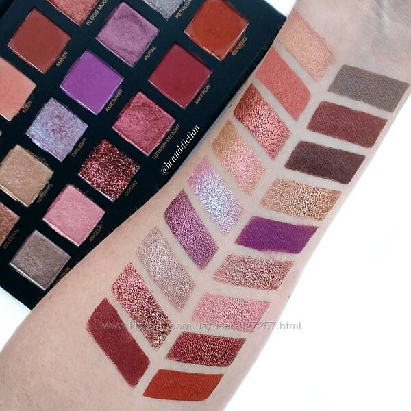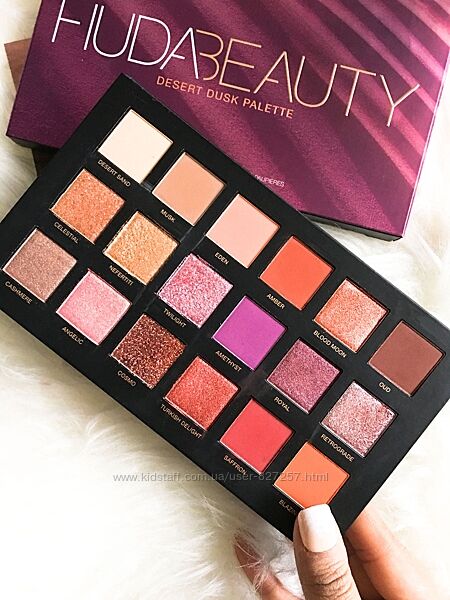 Наносить такие тени можно как пальцем, так и кисточкой. Названия оттенков в Huda Beauty Desert Dusk Palette : Desert Sand (персиковый оттенок с матовым финишем) Musk (тауп с теплым подтоном и матовым финишем) Eden (приглушенный оранжевый оттенок с матовым финишем) Amber (красно-коричневый оттенок с матовым финишем) Blood Moon (насыщенный медный оттенок с жемчужным финишем) Oud (приглушенный темно-коричневый оттенок с матовым финишем) Celestial (коричневый оттенок с персиковым подтоном и розово-золотыми дуохромными частичками) Nefertiti (золотой сияющий оттенок с жемчужным финишем) Twilight (лавандовый оттенок с розово-фиолетово дуохромными частичками) Amethyst (яркий фиолетовый оттенок с матовым финишем) Royal (сливово-коричневый оттенок с розовыми вкраплениями и жемчужным финишем) Retrograde (насыщенный медно-коричневый оттенок с сине-зелеными дуохромными частичками) Cashmere (тауп с металлическим сиянием и жемчужным финишем) Angelic (розовый оттенок с холодным подтоном и золотым шиммером с жемчужным финишем) Cosmo (темный медный оттенок, чистый глиттер) Turkish Delight (насыщенный винный оттенок с металлическим сиянием с жемчужным финишем) Saffron (приглушенный темно-красный оттенок с теплым подтоном с матовым финишем) Blazing (насыщенный темно-оранжевый оттенок с матовым финишем).