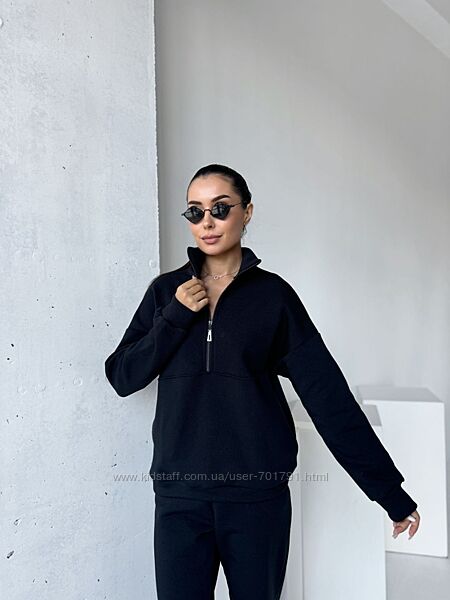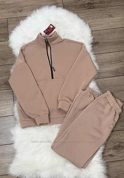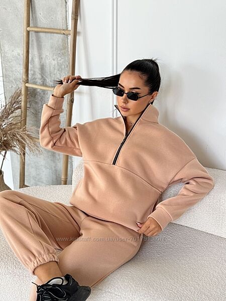 Твій ідеальний базовий костюм у стильному дизайні у трьох базових кольорах беж, чорний , сірий. Костюм складається зі світшота оверсайз із застібкою - блискавкою на грудях і стійкою на комірі, довгим спущеним рукавом, прилеглими манжетами на рукавах і талії. штани прямого крою з високою посадкою та манжетом на гумці