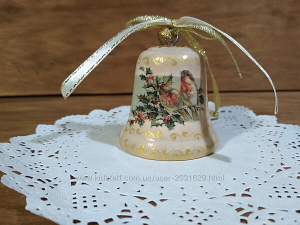 Керамический колокольчик с язычком, звенит средне, выполнен в технике декупаж, в работе использованы акриловые лакокрасочные материалы на водной основе. Размер колокольчика 5*5 см. Может быть украшением на елку. Возврат не предусмотрен.