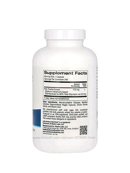 Подробное описание: Lake Avenue Nutrition расторопша 175 мг - 240 капсул / США, силимарин