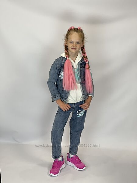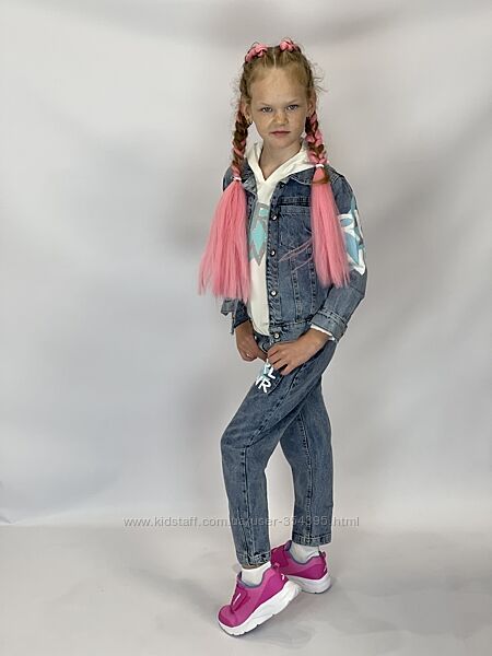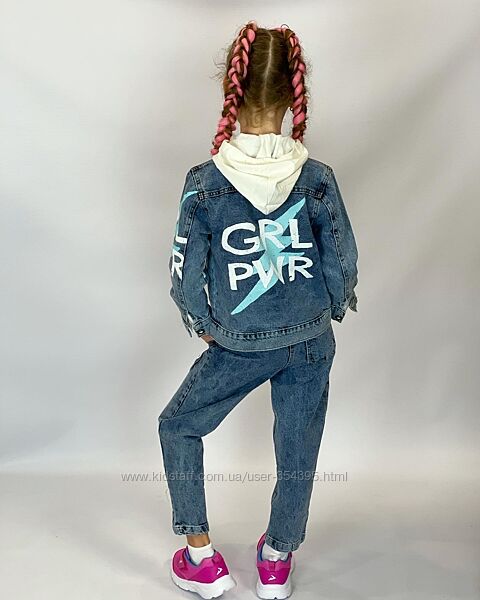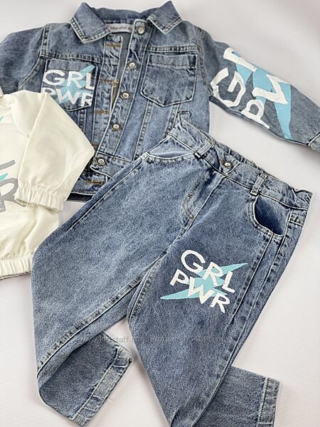 Стильний джинсовий комплект 3-ка для Вашої красунечки! Джинси, джинсова куртка з модним принтом, худі з капюшоном - ось ідеальний образ для активного відпочинку чи прогулянок.✅ РОЗМІРИ В НАЯВНОСТІ: