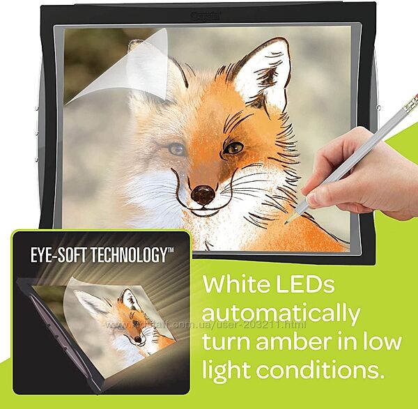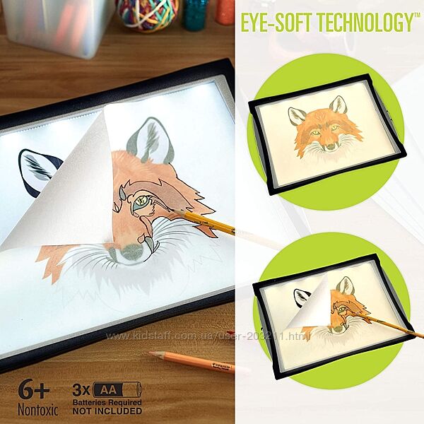Планшет с лед подсветкой, технологией Eye-Soft и белыми светодиодами, переключателем 3 режимов (Выкл. / Вкл. / Авто), 20 листов кальки, 12 коротких цветных карандашей и 1 карандаш номер 2 (Требуются 3 батарейки AA. Продаются отдельно)