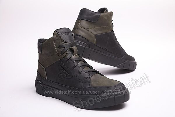 Зимние мужские кожаные ботинки Guess Los Angeles оливковые с чернымМатериал верха – натуральная кожа