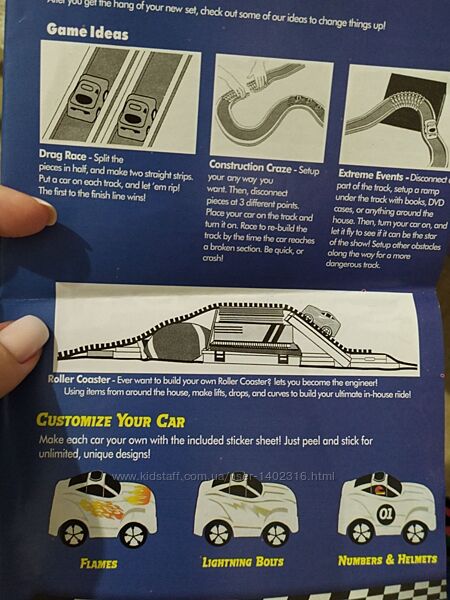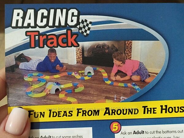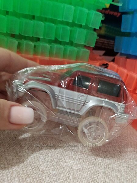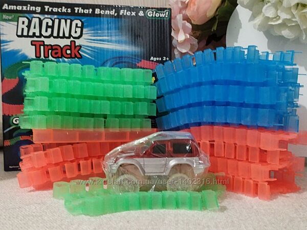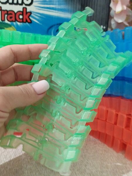 Все детали трека легко гнутся и светятся в темноте за счет накаливания от света (не сильно), трек начинает ярче светиться за счет огней машинки которая ездит по полупрозрачному пластику. Гоночные машинки оснащены яркими светодиодами. Набор изготовлен из очень качественного пластика, не имеет острых углов, запаха. Все детали трека разработаны таким образом, что все они легко и надежно соединяются между собой.