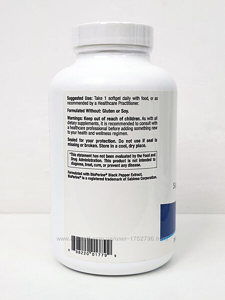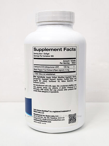 Коензим Q10 (кофермент Q10, убіхінон) визнаний необхідним для нормальної роботи мітохондрій, а дослідження показують, що він підтримує здоров´я серцево-судинної системи та загальне здоров´я серця. Коензим Q10 Lake Avenue Nutrition сертифікований USP. Екстракт чорного перцю BioPerine® сприяє кращому засвоєнню та підвищенню біодоступності коензиму Q10.