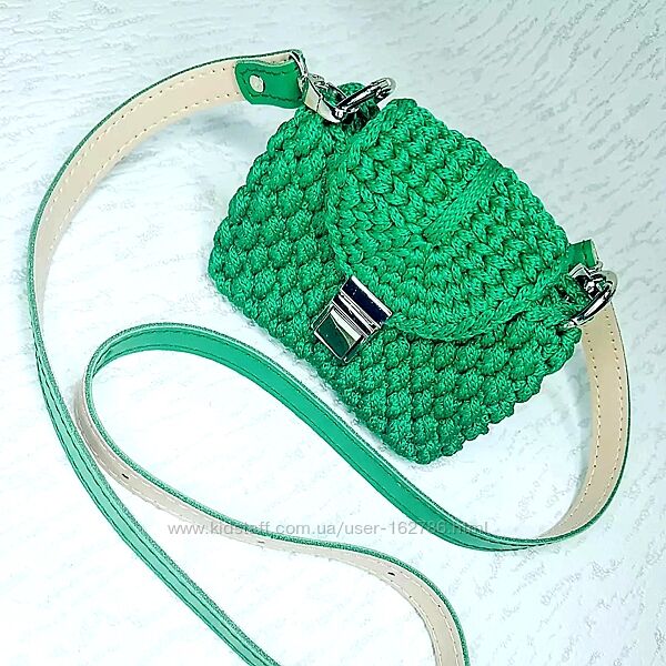 Сумка Micro. Повний ексклюзив! Ручна работа. Розмір 12 х 7 х 9см. Плечовий ремінь з натуральной шкіри 120×1,5см. Звязана з поліефірного шнура, який не міняє колір з часом. Фурнітура в кольорі срібро, підклад з натурального льону.