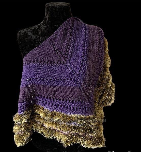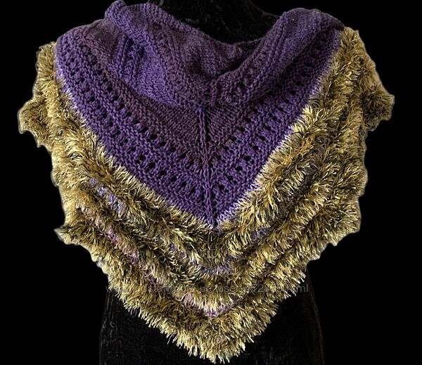 Очаровательный мягкий треугольный шарф бактус в фиолетово- лиловых тонах. Декорирован пышной каймой золотистого цвета.Отличный осенний аксессуар.