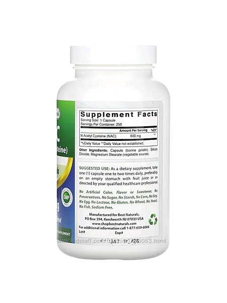 Подробное описание: Best Naturals NAC 600 мг - 250 капсул / США, ацетилцестеин