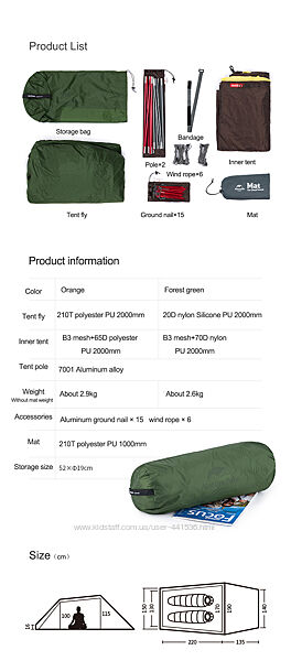 Зовнішній тент: силіконізований нейлон 20D, PU 2000;