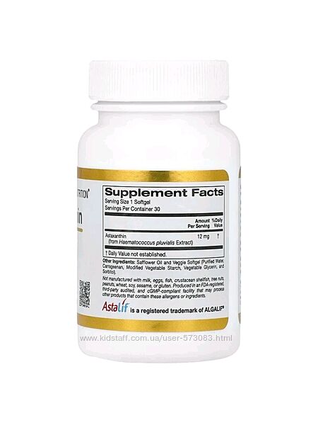 California Gold Nutrition содержит чистые исландские водоросли AstaLif и извлекается с применением сверхкритической углекислотной экстракции без использования растворителей. Растительные мягкие таблетки (без использования свиного и бычьего желатина) производятся в США
