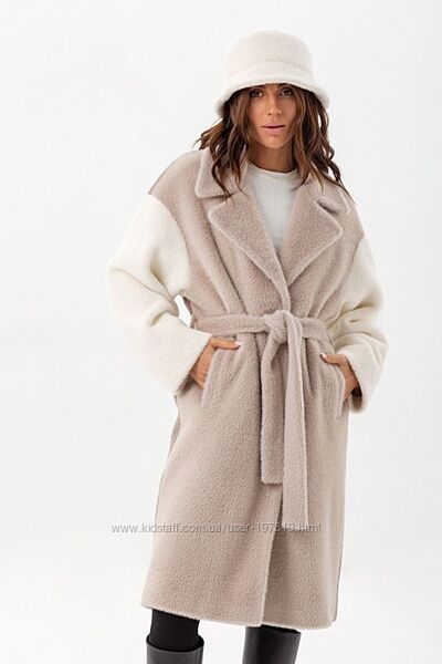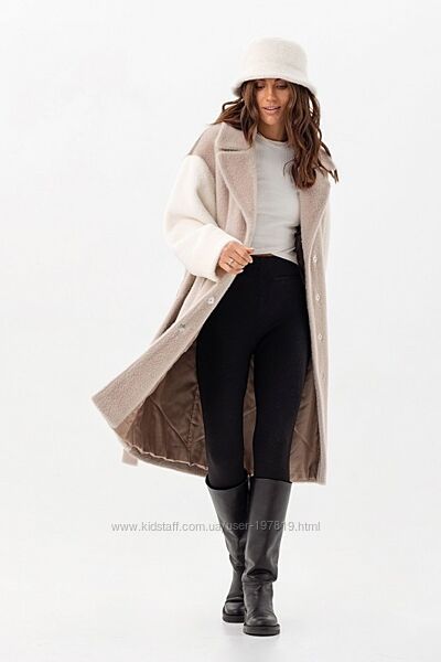 Дизайнерское пальто из экоальпаки «Амура» теплое, пушистое и очень заметное! Для изготовления шубки использовано 3 цвета, гармонично сочетающиеся между собой. Спинка – более темная (цвет капучино), лицевая сторона – среднего тона (бежевый). Рукава белого цвета.Модель с английским воротником. Рукава широкие, спущенная линия плеча. Модель застегивается металлическими кнопками. Есть прорезные карманы с листочком. Предусмотрены шлевки под пояс. Долина пальто – ниже колена.