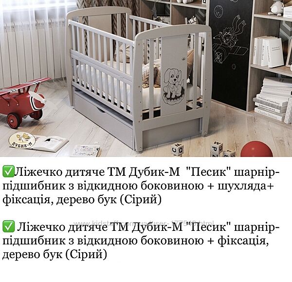 Кроватка детская Дубик-М Пёсик – 2900 грн, с ящиком – 3340 грнСамые сладкие сны приснятся малышу в кроватке Песик от Дубик-М. Кроватка выполнена из натурального дерева бук – дерево очень прочное и выносливое. Все лакопокрасочные материалы – европейского производства, на водной основе, абсолютно безвредные и безопасные для малыша и родителей. Кроватка оснащена маятниковым механизмом укачивания, абсолютно бесшумным, с фиксатором. Так же, обращаем внимание, что шарнир на маятнике выполнен так же из дерева, поэтому он более выносливый, нежели его пластмассовые собратья. Подматрасник имеет 3 положения высоты, так что родители всегда могут подобрать удобное для себя и для малыша. Размеры спального места: 120*60 см. А откидной бортик с фиксаторами поможет с легкостью достать кроху из кроватки.