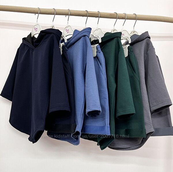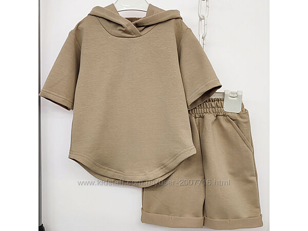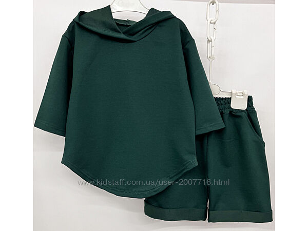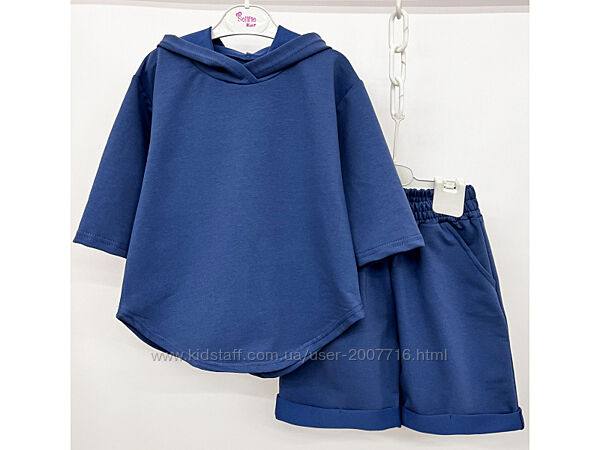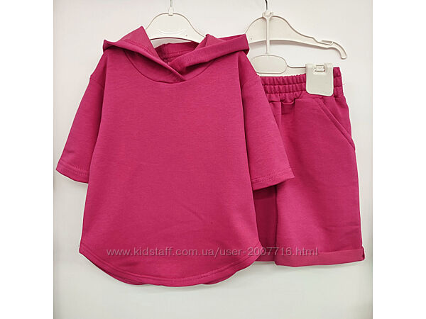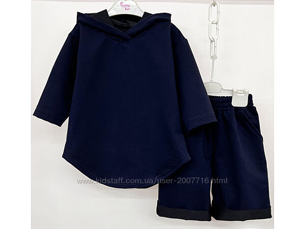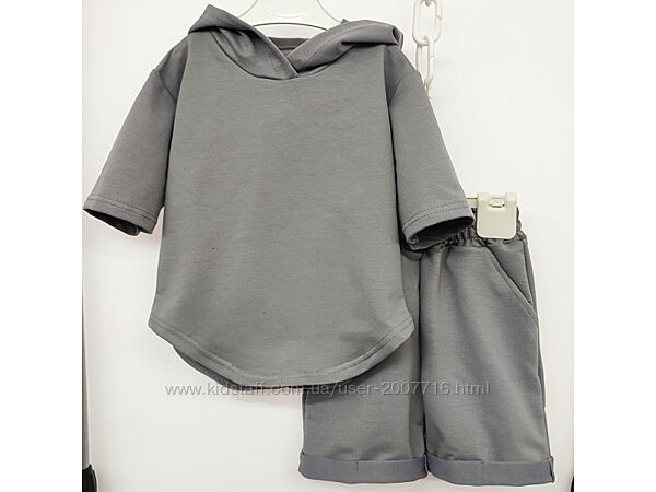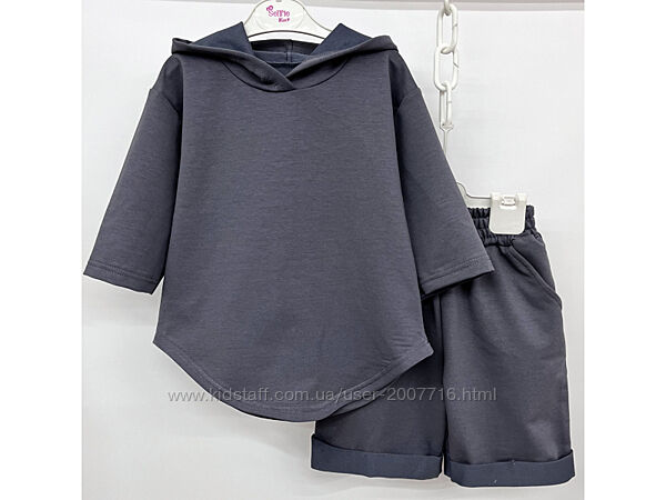 Костюм для хлопчика та дівчинки складається джемпер з рукавом 3/4, є капюшон, вільного покрою, низ джемпера фігурний + подовжені шорти, також вільного покрою, верх резинка широка, з боків є кармани. Практичний костюм, якість полотна дуже класна, не кошлатиться.Пошитий з хб тканини 2-х нитки, вона відрізняється особливою міцністю і еластичністю.