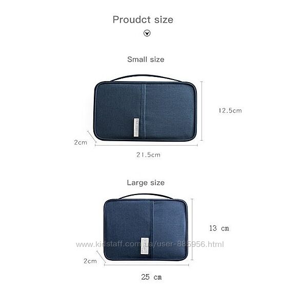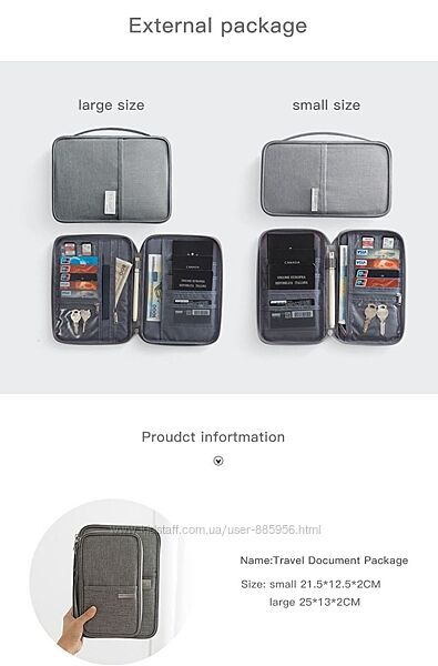 Дорожній органайзер для документів виготовлений з матеріалу оксфордського типу плетіння, що надає тканині міцність і водонепроникність. Закривається на блискавку, є дві зовнішні кишені, в які можна покласти посадочні талони або мобільний телефон, одна з них закривається на блискавку.Всередині є три кишені для паспорта і сітчаста кишеня, а також відділеня для банківських карток, невелика прозора кишеня на блискавці. У цьому органайзері ви можете розмістити пакет проїзних документів для всієї родини.