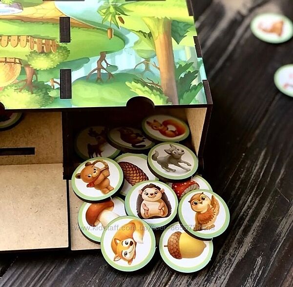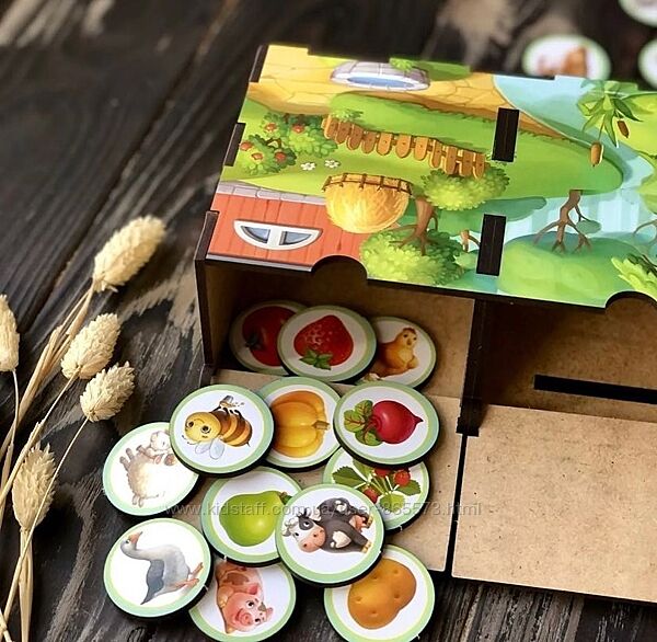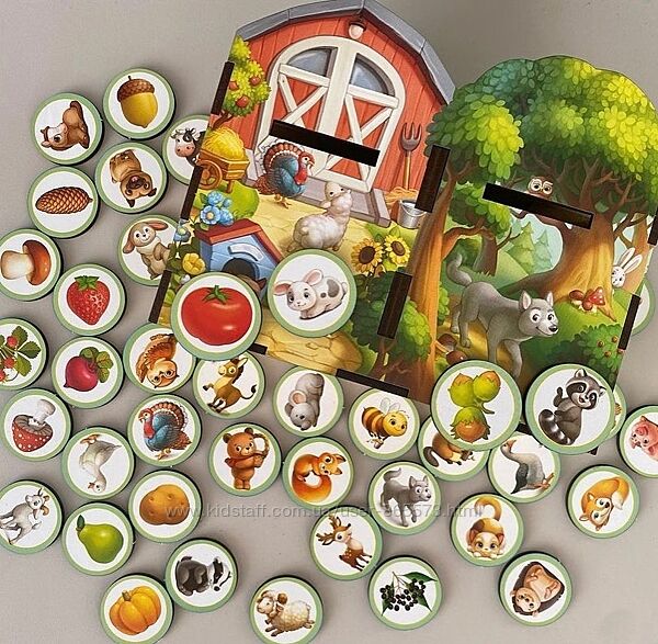 Сортер-скарбничка "На фермі чи у лісі"У наборі: 40 плашок та яскравий комодик, розділений на 2 скарбнички, в які дитині потрібно правильно розсортувати плашки з картинками. Дикі мають потрапити до лісу, а домашні – на ферму. Крім плашок з тваринами в наборі йдуть фрукти, овочі, ягоди та гриби, які дитині теж потрібно правильно розкласти: гриб росте в лісі, а помідор на городі, отже гриб відправляємо у скарбничку із зображенням лісу, а помідор – на ферму.