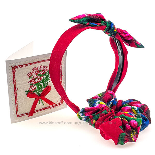 Подарунковий набір стане в нагоді, якщо не знаєте, що подарувати вашій знайомій. Адже він буде актуальним як і для дівчаток, так і для жінок старшого віку. Подається в гарній дизайнерській коробці, виготовленої із чорного дизайнерського картона.Набір складається із обруча, резинки для волосся, які виготовлені з яскраовї хустки. Також в комплект входить вишита та декорована міні листівка.