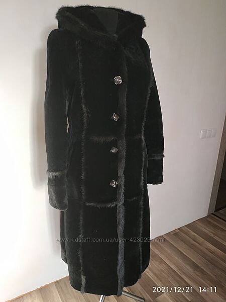 Длинная шуба из мутона овчина с капюшоном вставки норка 50 р.