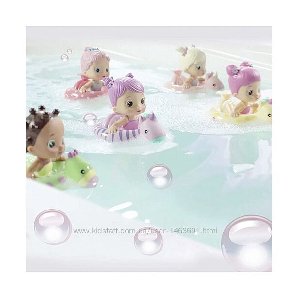 Набор для купания из 4 куколок и одного органайзера-сетки. Куколки заводные. Если потянуть за веревочку они начинают барахтаться ножками и тем самым плывут. Сделаны в очень нежных, милых цветах . У каждой есть круг в виде животного.Отлично подойдёт на подарок.