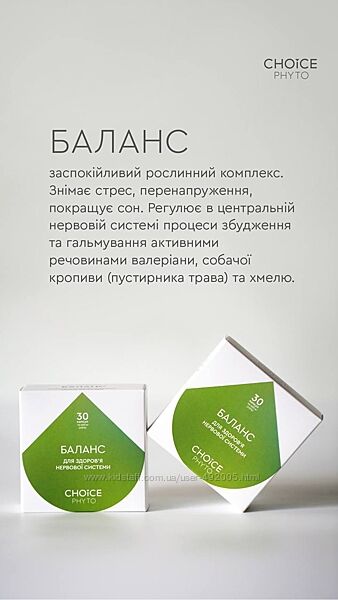 Баланс – заспокійливий рослинний комплекс. Знімає стрес, перенапруження, покращує сон. Регулює в центральній нервовій системі процеси збудження та гальмування активними речовинами валеріани, собачої кропиви (пустирника трава) та хмелю.