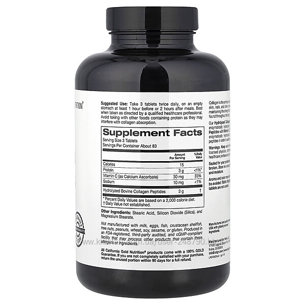 Комплекс гидролизованного бычьего коллагена с витамином C California Gold Nutrition содержит уникальные, клинически исследованные, гидролизованные ферментативным путем низкомолекулярные пептиды коллагена и витамин C.