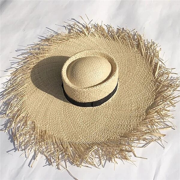 Ідеальний варіант для відпустки! Капелюх з широкими полями та бахромою, фігурний верх, чорна стрічка по діаметру.100% рафія.