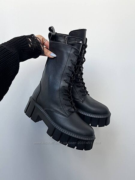 Ботинки - берцы женские, зимние, кожаные, черные, натуральная кожа