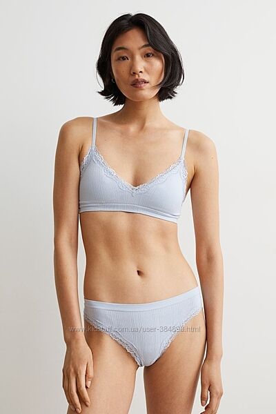 Трикотажные трусы H&M в рубчик с кружевной отделкой. Классический крой, высокий вырез на спине и мягкая ластовица. Для приятного ощущения кожи эта модель имеет в основном бесшовную конструкцию.Приблизительные замеры:Размер XS: полуобхват резинки в спокойном состоянии 30 см( тянется до 44 см), высота по центру 20,5 см, ширина бока 6 см.