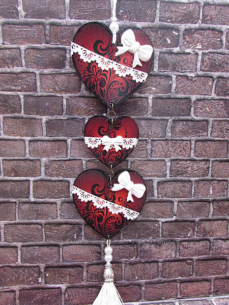 Подвеска состоит из трех сердечек, разного размера.Подвеска декорирована в технике декупаж, украшена гибким кружевом и отливкой ручной работы,бантик.