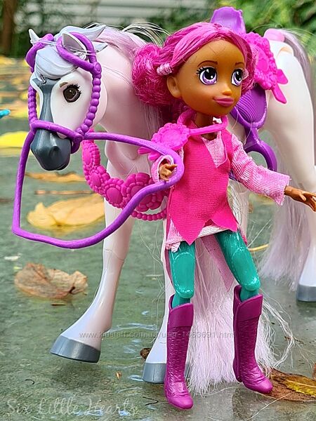 Набор из 11 деталей включает в себя 5-дюймовую куклу , 7-дюймовую лошадь по имени , шляпу/шлем для верховой езды, ожерелье, щетку, седло, уздечку, ленту для лошади, хвост, один аксессуар-сюрприз и подставку для лошади.Отличный набор для любителей куколок и лошадок)