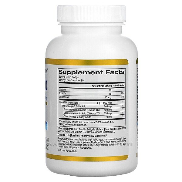 California Gold Nutrition, омега 800, ультраконцентрированный рыбий жир с омега-3, в форме триглицеридов KD-Pur, 1000 мг, 90 капсул из рыбьего желатина30 шт - немає