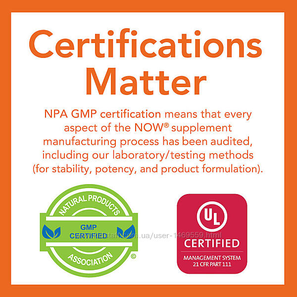 Під час виробництва не використовуються дріжджі, пшениця, глютен, молоко, яйця та молюски. Виготовляється на підприємстві, що має реєстрацію належної виробничої практики (GMP), де здійснюється оброблення інших інгредієнтів, що містять ці алергени.