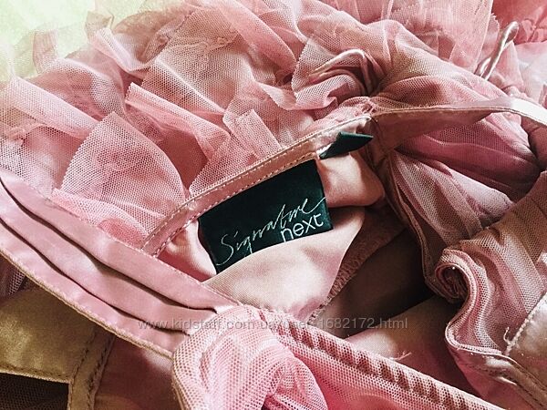NEXT SIGNATURE. Премиум коллекция Next. 5 и 11 лет Лимитированная серия. Шикарное платье с супер - пышной юбкой-пачкой , как у балерины. Многослойных и многоярусный фатин. Верх с шикарной драпировкой расшит пайетками. Состояние идеальное.5 лет Длина 72; подмышки 30,5