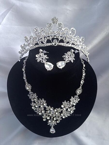 1. Диана- Общая длина колье-52см, плюс 5 см дополнительные звенья цепочки. Размер серёжек: 5,5см, самая широкая часть-2,7см. ( приблизительно). Размер тиары: длина-24см, высота-5см, крепится шпильками. Набор бесподобный,с австрийскими кристаллами и горным хрусталем,под серебро. Качество отличное, смотрится очень дорого и эффектно.-450грн(1.2 фото)2. Каролина-Общая длина колье-52см, плюс 5 см дополнительные звенья цепочки. Размер серёжек: 5,5см, самая широкая часть-2,7см. ( приблизительно). Размер тиары: длина-24см, высота-6 см, крепится шпильками. Набор бесподобный,с австрийскими кристаллами и горным хрусталем,под серебро. Качество отличное, смотрится очень дорого и эффектно.-480грн(3.4 фото)