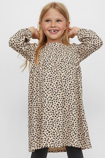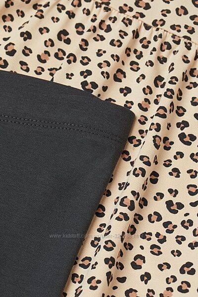 Платье и легинсы из мягкого хлопкового трикотажа. На платье набивной рисунок и длинные присборенные рукава с узкими завязками снизу. Присборенный шов сверху для дополнительной ширины юбки. Легинсы с мягкой резинкой на талии.Количество2