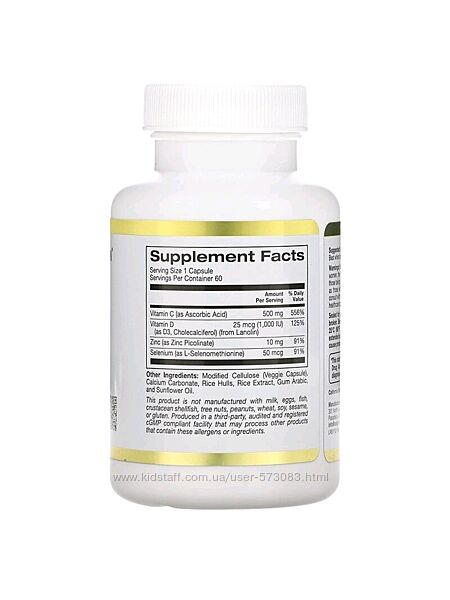 - Содержит 4 основных ингредиента: витамин С, витамин D, цинк и селен.