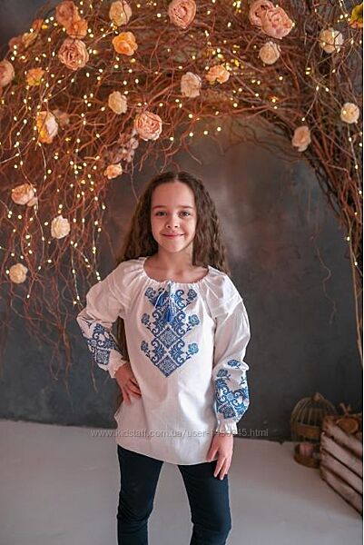 Вишиті сорочки для дівчаток із синім орнаментом вишитим на рукавах і грудях. Рукав-реглан має манжет на резинці, що забезпечує зручну посадку на руці, виріз горловини регулюється китицями.Тканина: 100% бавовна (бязь).