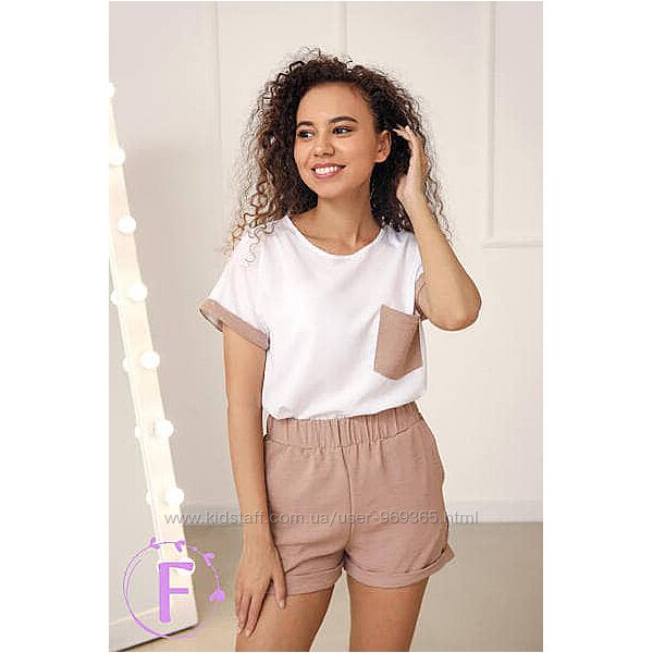 Низ – короткие шорты с поясом на резинке и карманами. Посадка изделия с завышенной талией, штанины с отворотами.