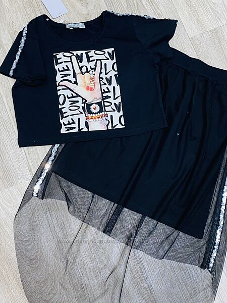 Фирменный крутой костюм юбка с фатином и кроп топ 134-170 рост