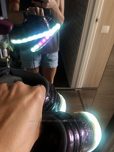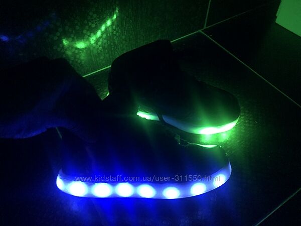 Кроссовки после одного ребёнка. Размер 28 европейский. На ножку 17,5 см. Покупали в Англии. Цена была 54 фунта (2000 грн без учета доставки). Укомплектованы переходником на два разъёма, заряжаются от сети. Очень красивые, яркие цвета. Светятся безперебойно примерно 2 часа. Состояние хорошее. Светятся 7 разными цветами: красный огненный, неоновый лайм, холодный голубой, ярко зелёный, лавандовый и цвет морской волны. Так же доступны 4 световых шоу (разные вариации когда они сами меняют цвет). Дети в восторге от такой обуви. Цвета переключаются кнопочкой на язычке. 3 пикселя сбиты и в некоторых расцветках светят другими цветами, но они изнутри и не критически видны.Другие объявления продавца