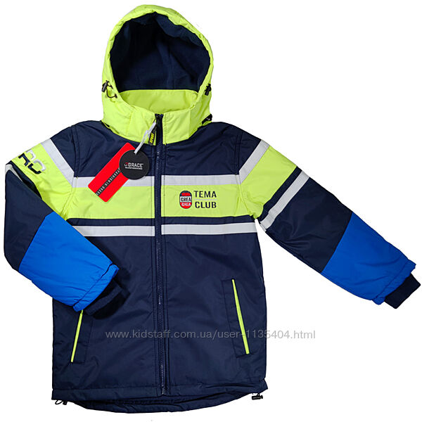 ШАНОВНІ ПОКУПЦІ, ПЕРЕД ТИМ ЯК ЗАМОВЛЯТИ ТОВАР, ВЕЛИЧЕЗНЕ ПРОХАННЯ ОЗНАЙОМИТИСЯ З УМОВАМИ ОПЛАТИ І ДОСТАВКИ.Куртка пряма демісезонна для хлопчиків. Нова модель від відомого бренду GRACE. Зверху відмінної якості водовідштовхувальна плащівка на одинарному утеплювачі та флісовій підкладці. Глибокий зручний знімний капюшон. Висока стійка, добре захищає від вітру. Дві кишені з боків. Спереду і на рукаві емблема вишивка. По низу рукава манжет з трикотажної гумкою. Спина трохи довше переду. Дуже добротна і стильна куртка для сучасних хлопців. Відмінно буде виглядати з джинсами і брюками, які можна вибрати на сайті нашого інтернет-магазину.