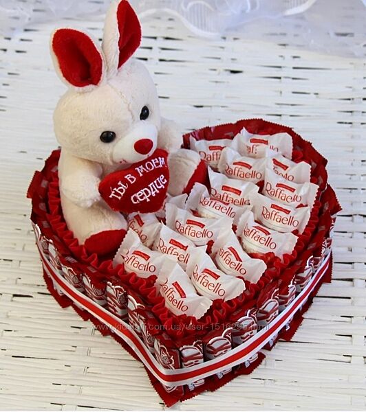 Сердечко зі смаколиками,можливий любий склад по вашему бажанню.Ціна від 350 грн.Можно писати у Вайбер 0660164929.Також є в наявності бокси бокал виний ,кружки пивні.Другие объявления продавца