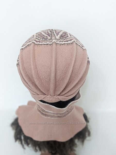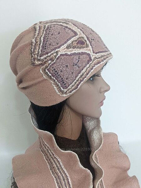 Шляпка сваляна из самой нежной и мягкой мериносовой шерсти, совершенно не колется, голова дышит, прическа всегда в порядке:)