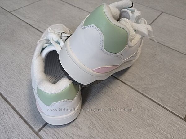 Белые кроссовки с эффектными деталями и элементами розового, синего и пастельно-зеленого цветов.