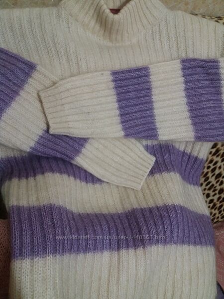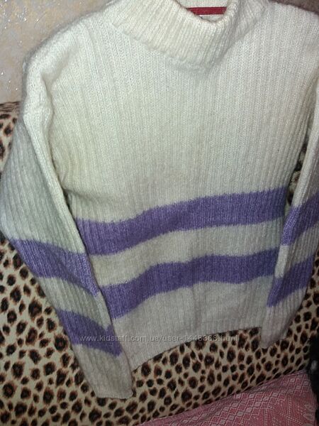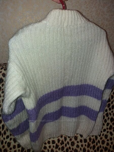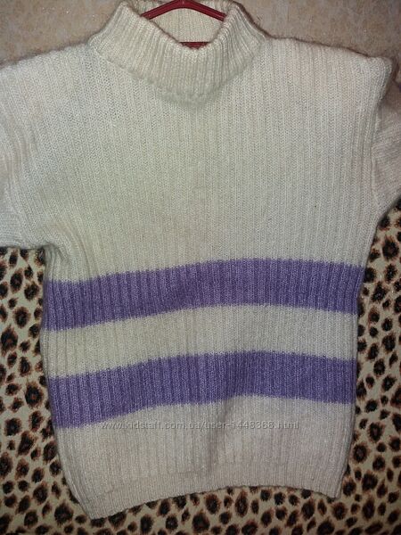 Свитер шерстяной. Очень мягкий. Цвет белый с сиреневым. Состав натуральная шерсть (махер). Воротник стойка 6 см. По низу резинка.Одет был один раз. Без видимых следов носки. Без каких либо дефектов. Размер 46-48. Замеры: рукав длина 55 см, плечё 16 см, длина изделия 60 см, ПОГ 50 см, ПОБ 46 см.