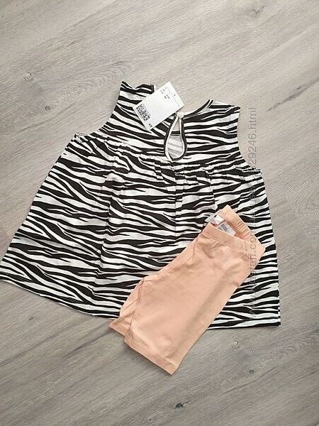 Костюмчик для девочки из 2-х вещей фирмы Н&М.Белый топ без рукавов с зебровым принтом застегивается на пуговицу сзади для удобства переодевания. Круглая горловина, расклешенный дизайн. Яркие вело-шортики с поясом на эластичной резиночке. Такой костюм отлично подойдет для прогулок и подвижных игр в летние жаркие дни. После стирки не теряет исходную форму и цвет. Сделан из очень высококачественного натурального трикотажа.