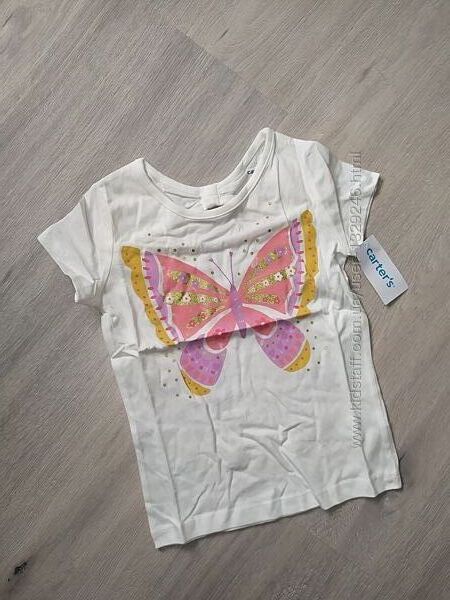 Милая футболочка из мягкого натурального трикотажа для девочки фирмы Carters.Выполнена в белом. Впереди принт с блестящей бабочкой, которая обязательно понравится ребенку. Открытый дизайн спинки. Горловина круглая и уплотненная. Такая удобная и красивая вещь отлично дополнит собой обыденные летние образы модницы. Футболка не теряет цвет и не меняет форму после многократной стирки.
