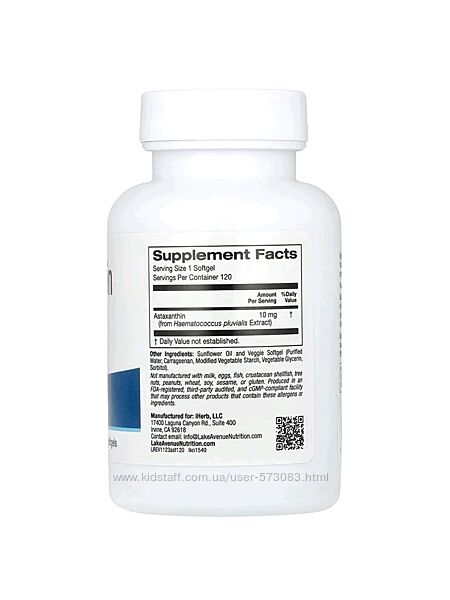- Астаксантин от Lake Avenue NutritionИз экстракта гематококка (Haematococcus pluvialis)