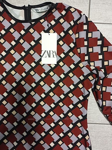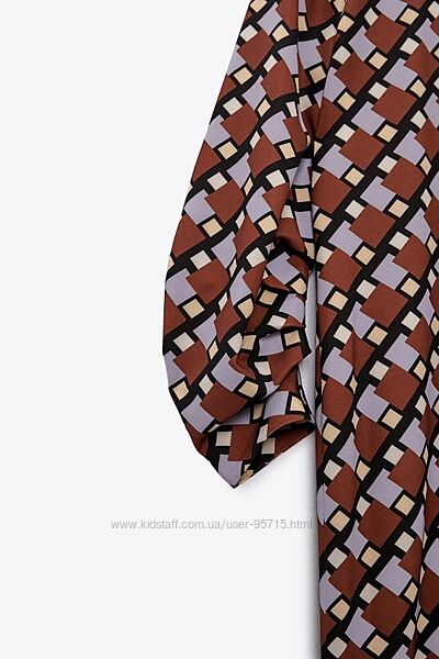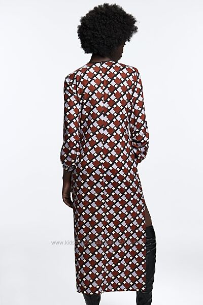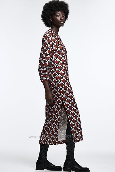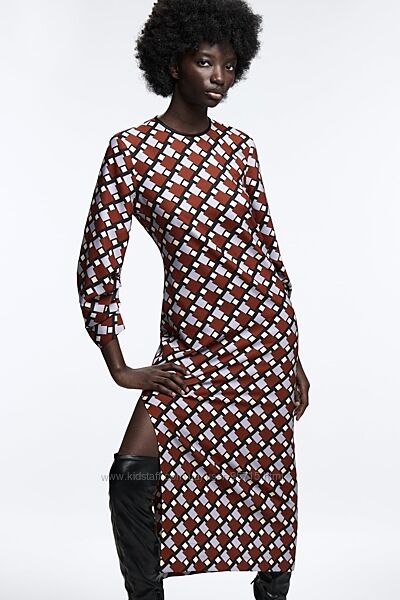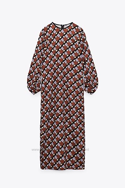 Платье миди с круглым вырезом. Длинные рукава со сборками, боковой разрез. Потайная застежка-молния сзади.