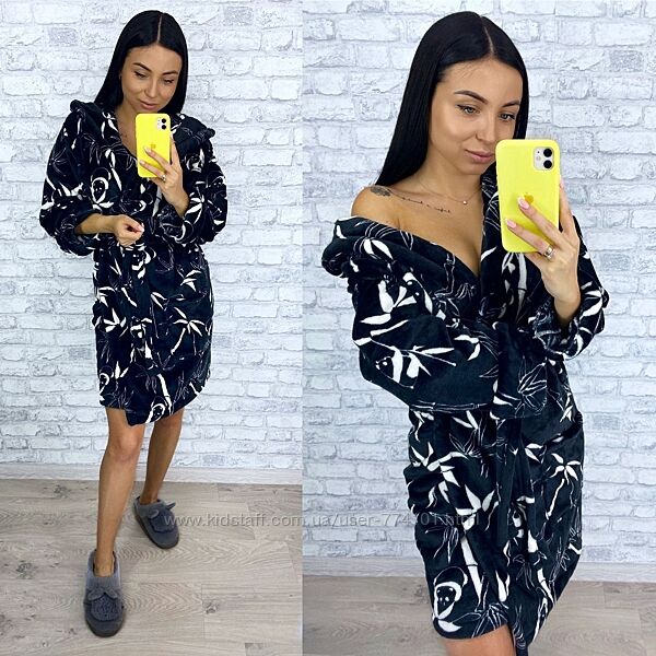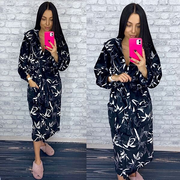 М´який, затишний та тепленький халатик з двостороннього велюр плюшу.З капюшоном , є кишені , пасок.